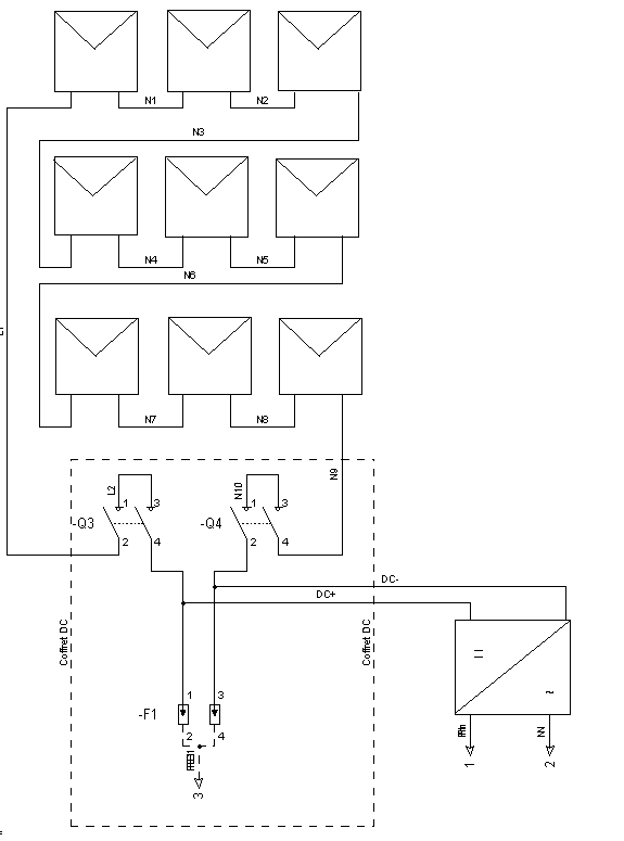 Once the site characteristics were validated, the system design and dimensioning phase was carried out. The photovoltaic installation was designed with a total peak power of approximately 3.24 kWp, based on nine monocrystalline photovoltaic modules rated at 360 W each. The modules were mounted on an aluminum ground-mounted structure oriented due south with a tilt angle of 30°, ensuring near-optimal annual energy production. All components of the DC and AC electrical architecture were dimensioned, including string configuration, inverter selection, cable sections, and protective devices, in compliance with UTE C15-712-1 standards. The SMA Sunny Boy 2.5 inverter was selected following detailed voltage, current, and power compatibility calculations.