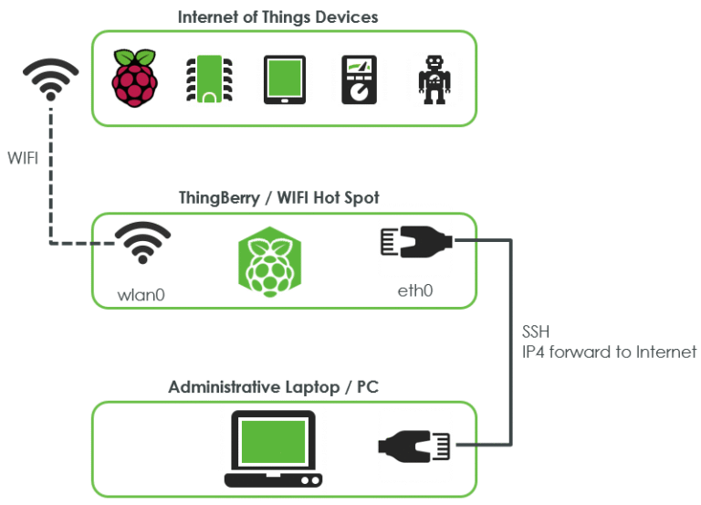 This diagram illustrates the overall architecture of the Raspberry Pi-based Wi-Fi hotspot and the communication flow between connected devices and the Internet.