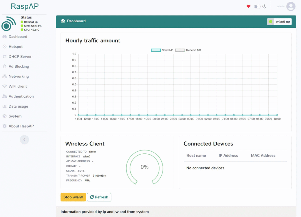 RaspAP was installed to transform the Raspberry Pi into a functional Wi-Fi hotspot, managing DHCP services, IP addressing, SSID configuration, and wireless security through a web interface.